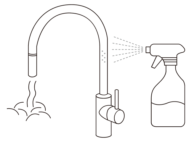 將裝有檸檬酸水的噴瓶對準龍頭水垢或鏽斑位置,按壓噴嘴5~7次,確定水垢或鏽斑位置皆有噴濕,靜待20分鐘提升後續刷洗效果。