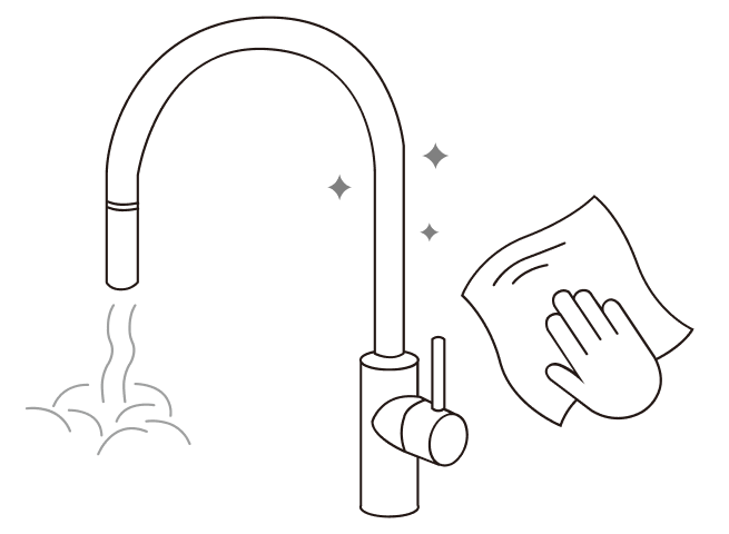 龍頭保養部分,建議可定期以中性清潔劑清洗及乾淨抹布擦拭乾淨;避免使用強酸鹼化學性清潔用品及鋼刷清洗水龍頭,造成表面傷害,洗劑中的化學物質也容易造成不鏽鋼表面產生泛黃或鏽斑的情形發生。(保養部份亦適用一般龍頭)